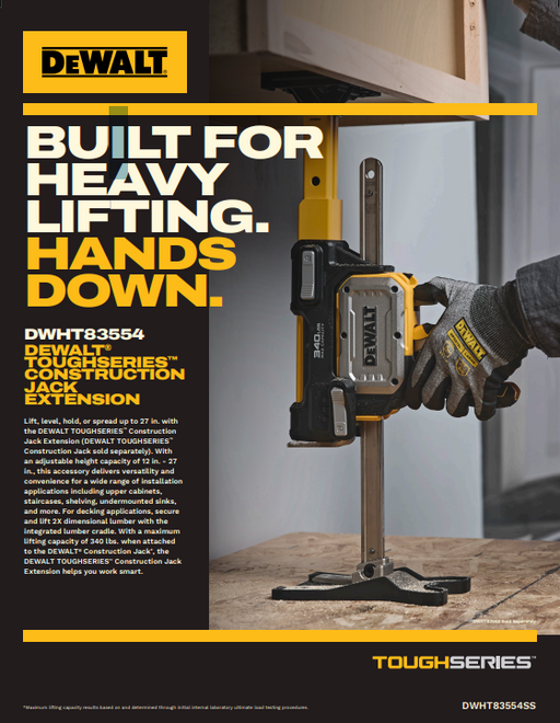 DeWaltLIFT, LEVEL, AND LIGHTEN THE LOAD: DEWALT TOUGHSERIES™ CONSTRUCTION JACK DWHT835501 Conquer demanding jobsite challenges with the DEWALT TOUGHSERIE...
