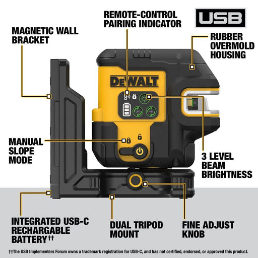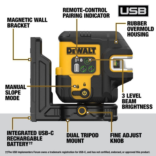 DeWaltWhat's Included (1) USB Rechargeable Green Cross Line Laser (1) DCLEAUSBRC1 Remote Control (2 AA Batteries included) (1) Includes cable and charg...