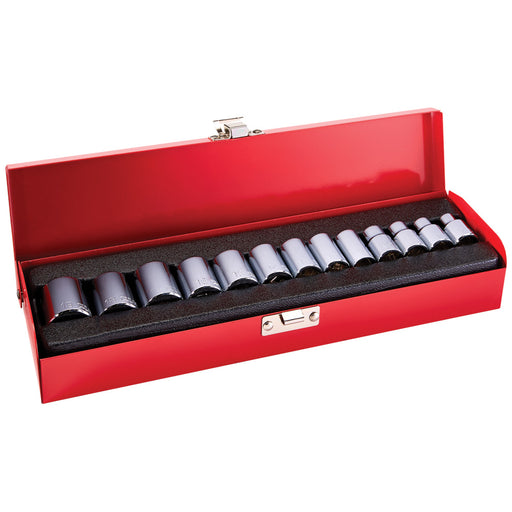 Klein Tools8-Piece 1/2-Inch Drive, Deep-Socket Wrench Set. Comes with a red hinged metal box. The set has eight 12-point deep sockets: 1/2-Inch, 9/16-Inch, 5/...