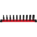 The MILWAUKEE® 10-Piece SHOCKWAVE Impact Duty™ 1/4 in. Drive SAE Deep 6 Point Socket Set features the boldest, longest-lasting markings and extreme impact durability in high torque applications. The stamped and ink-filled size marking makes selecting the right socket every time easy throughout the life of the socket. These Milwaukee sockets are engineered with high strength forged steel for optimized performance in heavy-duty applications. The non-slip hex geometry prevents fastener rounding, and a dual-hole design and ring groove allow for easy socket attachment and removal. The customizable Socket Rail comes with removeable end caps to add or take off socket clips for optimal storage. All SHOCKWAVE Impact Duty™ ™ Sockets backed by a Lifetime Guarantee and meet ASME industry standards.
