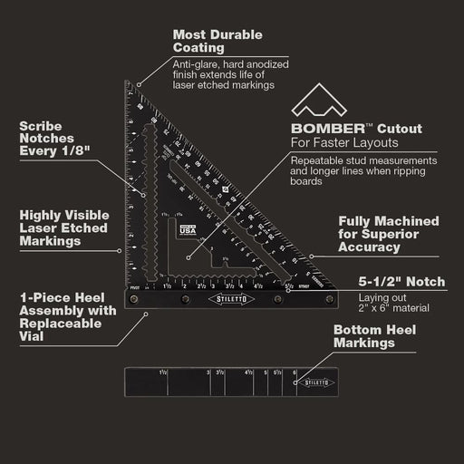 StilettoThe STILETTO® 7” Carpenter Square with Level is designed with more layout notches to help build and level faster. Additional notches aid in laying ...