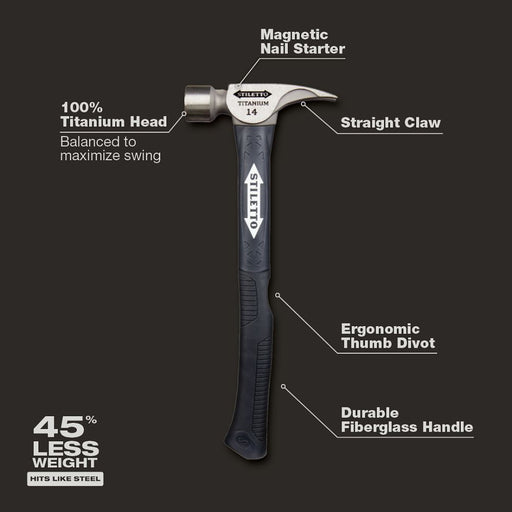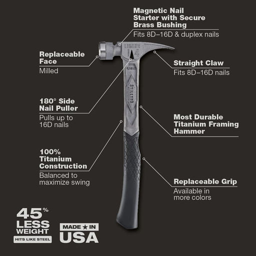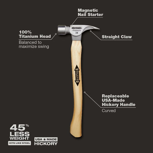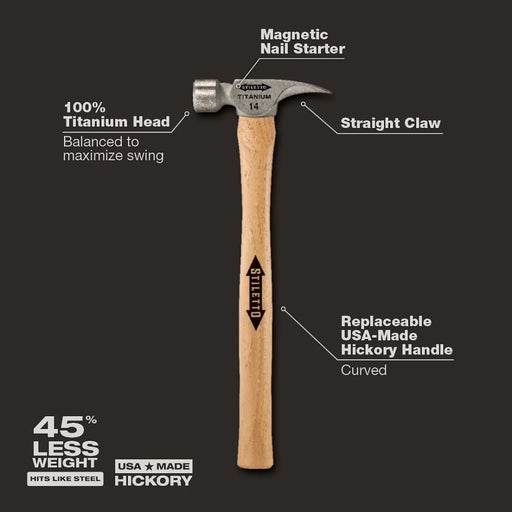 StilettoThe Stiletto TI14SS is a 14 oz titanium smooth face framing hammer with an 18 in. straight hickory handle. The hammer has a straight claw design an...