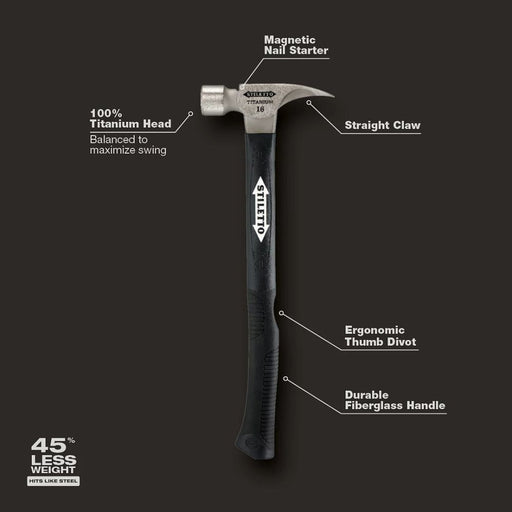StilettoThe Stiletto TI16MC is a 16 oz titanium milled face hammer with an 18 in. curved hickory handle. The hammer has a straight claw design and Stiletto...