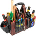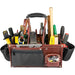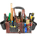 Una obra de arte industrial. Mango de cuero hecho a mano que se adapta a su agarre. Este portaherramientas de ocho por catorce pulgadas cuenta con 3 compartimentos con 45 bolsillos y portaherramientas. El cuerpo principal está construido de cuero para máxima calidad y durabilidad, y está diseñado con un innovador almacenamiento vertical para un acceso rápido.
