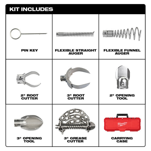 El kit de fijación de cabezal MILWAUKEE® de 1-1/4"-2" para cable seccional de 5/8" incluye todas las herramientas que necesita para eliminar las obstrucciones más comunes en líneas de drenaje más pequeñas. La construcción duradera de acero y el revestimiento RUST GUARD™ reducen la corrosión para proporcionar cabezales accesorios más duraderos. Este kit de herramientas para limpieza de tuberías incluye seis accesorios para cabezales de cable, una llave de pasador y un estuche de transporte. Está diseñado para funcionar con el cable seccional de viento abierto de Milwaukee de 5/8" x 7,5' diseñado para Milwaukee. Máquina Seccional M18 FUEL™ para Cable de 5/8" y 7/8".