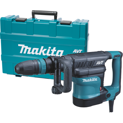 El martillo demoledor Makita de 11 lb tiene más potencia con 8.4 ft.lb. de energía de impacto, pero pesa sólo 11,1 libras. El HM0870C (acepta brocas SDS-MAX) tiene control de velocidad constante que aplica automáticamente potencia adicional al motor para mantener la velocidad bajo carga. Las configuraciones de ángulo de 12 puntas permiten que la punta se establezca en diferentes posiciones para la comodidad del operador. El martillo demoledor Makita HM0870C es ideal para trabajos horizontales.