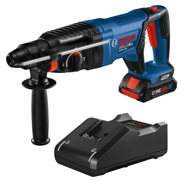 This Bosch D-handle Bulldog™ hammer consistently outperforms the best-selling 1 In. corded 11255VSR Bulldog™, making it better than the best. The GBH18V-26DK15 18V EC Brushless SDS-plus® Bulldog™ 1 In. Rotary Hammer Kit features a hammer that delivers 1.9 Ft.-Lbs. of impact energy, based on the industry standard of measurement agreed upon by the European Power Tool Association (EPTA). It weighs only 5.8 Lbs. (tool only, not including battery), delivering superior performance and an outstanding impact-to-weight ratio. The kit features a CORE18V Advanced Power Battery, which has next-gen Li-ion 21700 cell technology for extended performance in lightweight, high-power battery. The hammer’s EC Brushless motor maximizes battery runtime for extended performance. The tool features a jobsite-proven D-handle design with soft-grip and is ideal for overhead, horizontal and downward drilling applications. It also has KickBack Control, an integrated sensor to stop tool rotation in bind-up situations. The hammer features a variable-speed reversing trigger for accurate bit starting.