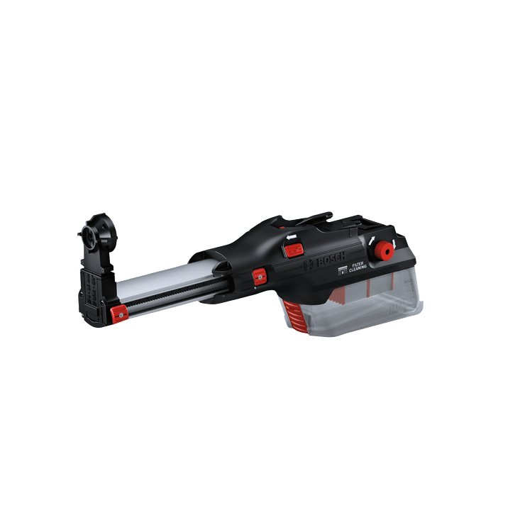 The GDE28D SDS-plus 1-1/8 In. Dust Collection Attachment allows users of the Bosch GBH18V-28DC 18V Bulldog™ to achieve maximum mobility around the jobsite with a dust-extraction solution, using only one battery. It has a filter cleaning mechanism to help remove excess dust and debris from the filter. It features a HEPA filter, helping users move toward compliance with OSHA silica dust regulations. The extractor mounts to the hammer, allowing use of the hammer’s fan to create suction in the extractor. This collector is activated through the engagement of the hammer trigger. This collector has auto power-on, providing vacuum suction automatically when drilling. It also has auto power-off, with a built-in two-second delay after releasing the hammer trigger, to allow collection of remaining dust. It comes with two Dust-Eye options (one small, one large) and a 4 In. extension. The large Dust-Eye option accommodates bit diameters up to 1-1/8 In. in diameter and the extension accommodates bit lengths up to 10 In. in length. The extractor has an aluminum guide rail for durability and smooth retraction of the Dust Eye during the drilling process. For convenience and flexibility, the dust container is transparent to check the actual dust level. It comes with a Dust Box Empty Flap. Simply open the flap on the back of the dust extraction unit to easily remove dust.