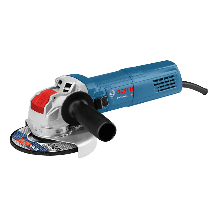 The Bosch GWX10-45E 4-1/2 In. X-LOCK angle grinder features the X-LOCK mount, offering a wheel change interface that's up to five times faster than conventional interfaces. There’s an audible snap when mounting an X-LOCK Wheel on an X-LOCK grinder. The wheel mounts properly without the need for a spanner wrench or flange nuts. The wheel is released from the grinder with the pull of a lever. The grinder features a narrow grip zone. The GWX10-45E ergonomic grinder features a narrow grip zone for extended comfort and control, combined with a powerful 10-amp motor. It delivers results, producing up to 11,000 no-load rpm for maximum productivity in grinding and cutting applications. The tool weighs 4.5 Lbs. Equipped with epoxy-coated field windings and direct-motor cooling, this grinder is built for a longer tool life. It features spiral bevel gears for smooth transmission of power. The lock-on/off slide switch provides improved user control during grinding and cutting applications. For added convenience, it has an auxiliary handle and an adjustable tool-free guard.