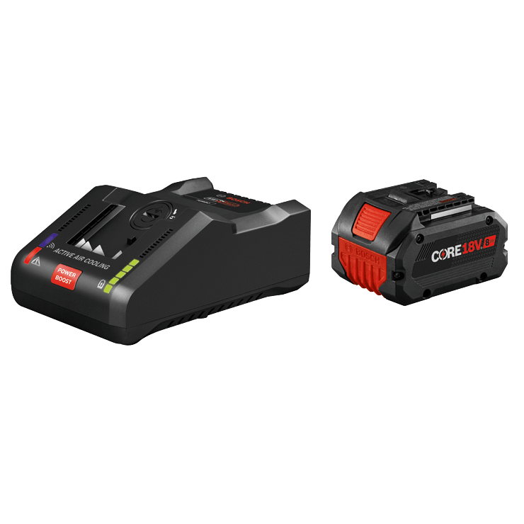 This 18V Starter Kit is the ideal solution to reducing downtime and increasing productivity for users tackling the most demanding and brutal applications. It includes an 8 Ah High Power Battery, which delivers 50% more runtime and over 75% more power than the CORE18V® 4 Ah battery, powering high-demand applications. The GBA18V80 features two layers of enhanced 21700 cells for greater battery efficiency. The battery has Bosch-exclusive CoolPack™ 2.0 Technology, which cools the battery faster and helps provide longer lifetime compared to Bosch 18V batteries without CoolPack™ 2.0. Its cutting-edge battery design offers increased efficiency, and it weighs only 2.14 Lbs. This battery is compatible with Bosch 18V tools and optimized to drive Bosch PROFACTOR™ tools with BITURBO Brushless™ Technology. It's compatible with Bosch 18V chargers and the AMPShare™ System. The air-cooled Bosch GAL18V-160C can fully charge a spent CORE18V® 8 Ah Lithium-ion battery in about 51 minutes in standard mode. It features an optional Power Boost™ mode, which boosts electrical current charging to 50% in the shortest time with compatible batteries.