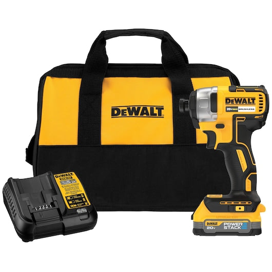 This Brushless Impact driver has a compact lightweight design and bright LED for working in dark or confined spaces. With up to 1,500 in-lbs. of torque this impact driver provides the power you need to complete a wide range of applications. The handle features an ergonomic design for balance and easier tool control. This cordless kit includes our most powerful, most compact, and lightest weight 20V MAX battery, with 50% more power, 25% more compact, and 15% less weight than the DCB203. The DEWALT POWERSTACK compact battery works with all DEWALT 20V MAX power tools and chargers.