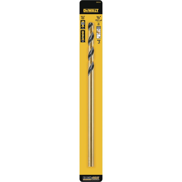 The DEWALT Black & Gold Metal Drill Bits feature a black and gold coating to prevent rust. The tapered web design provides extreme durability to resist breakage. The bits feature a 3-flats shank to reduce spin-out in the chuck. Black & Gold metal drill bits are made of heavy-duty High Speed Steel for drilling into a variety of materials including plastic, wood, and metal. Each bit features a 135° split point tip design to help reduce walking.