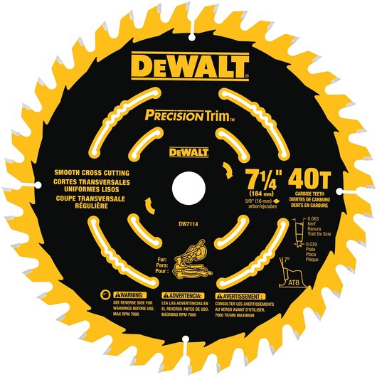 DEWALT DW7116PT 7-1/4 inch Precision Trim Miter Saw Blade, 60T is designed to be used with cordless miter saws as a general purpose saw blade. The blade features exclusive plate technology, with ultra sharp optimized carbide tips to reduce tear out. It features a miter saw optimized hook angle, with a new plate design for less vibration and better cut quality. Perfect for trim, moldings and pre-fabrication.