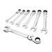 This 7-Piece Ratcheting Flex Head Combination Wrench Set (SAE) is made with Chrome Vanadium Steel for added strength and durability. The wrenches include stamped markings for easy wrench size identification.