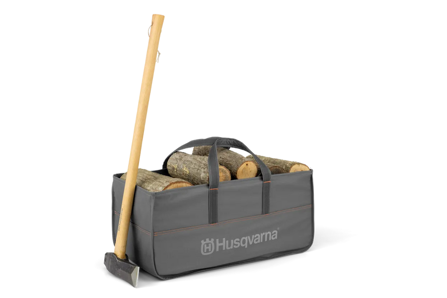 Heavy duty material features water resistant fabric top with protective waterproof backing. High density stitching for durability and padded handles for comfort. Makes collecting and carrying firewood easy and convenient. Bag folds flat for compact storage. Holds up to two bundles of wood.