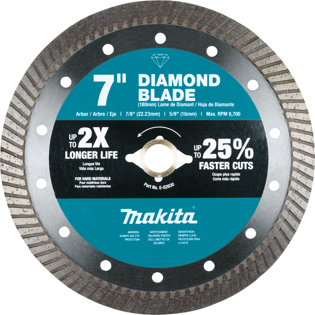 The Makita 7" Diamond Blade features a turbo rim design. The constant contact with the material delivers a smoother finish than segmented blades. Superior quality steel core is engineered for longer life.