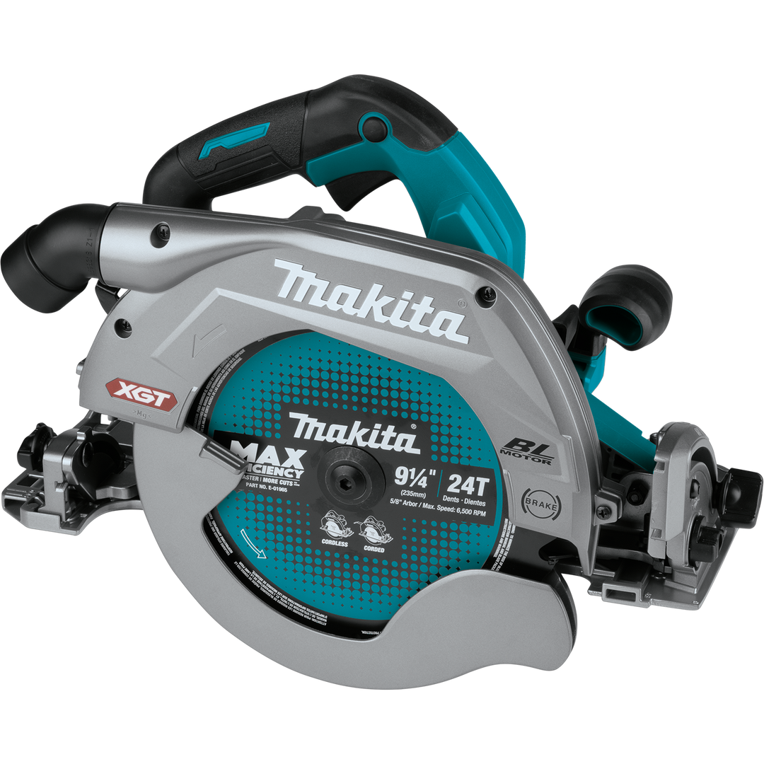 The 40V max XGT® Brushless 9-1/4" Circular Saw with Guide Rail Compatible Base combines efficient cutting with the convenience of guide rail compatibility. The Makita-built brushless motor delivers 4,000 RPM for fast cutting performance, with constant speed control that automatically applies additional power under load for optimum performance. It offers 3-3/8” of cutting capacity at 90° with bevel cut capacity up to 1° left and 60° right with positive stops at 22.5° and 45°. It features a die-cast magnesium base, blade guard, and blade cover for lower weight at only 10.4 lbs. with battery (battery sold separately).