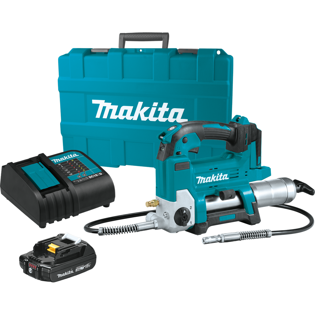 The 18V LXT Grease Gun Kit (XPG01SR1) is an ideal cordless solution for the workshop or garage. The powerful Makita-built motor delivers up to 10,000 PSI of max pressure. With a maximum flow rate of 10 oz. per minute, users can work faster. There are two speed modes, low and auto-speed, that are adjusted by a variable speed trigger. A lock-on button provides convenience during longer work periods.