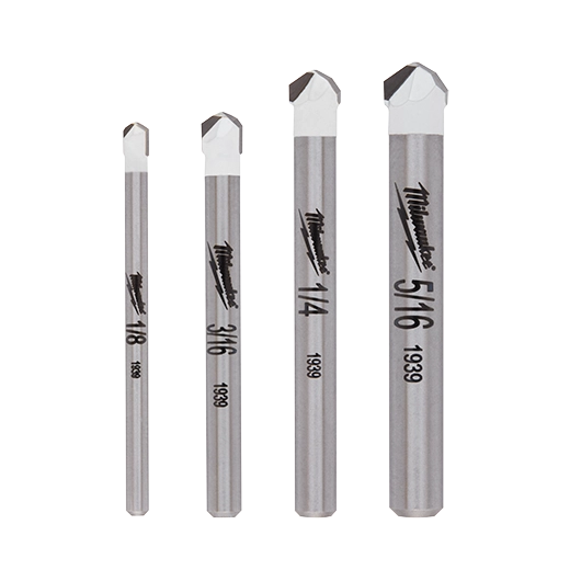 Our 4-Piece Tile and Natural Stone Drill Bit Set delivers up to 2x life in granite, stone, ceramic tile, and glass. Hammer mode capability provides faster drilling speeds when drilling natural stone tiles, like granite and marble. Equipped with an aggressive 8-grind carbide head, these bits deliver up to 20% faster drilling. These bits feature reinforced tips that protect the carbide head, providing the durability needed for use in hammer drill mode. MILWAUKEE® Tile and Natural Stone Bits can be used in drill-only mode or hammer drill-mode, and we don't recommend them for porcelain tile. This kit includes (1) 1/8", (1) 3/16", (1) 1/4", and (1) 5/16" drill bit for natural stone.