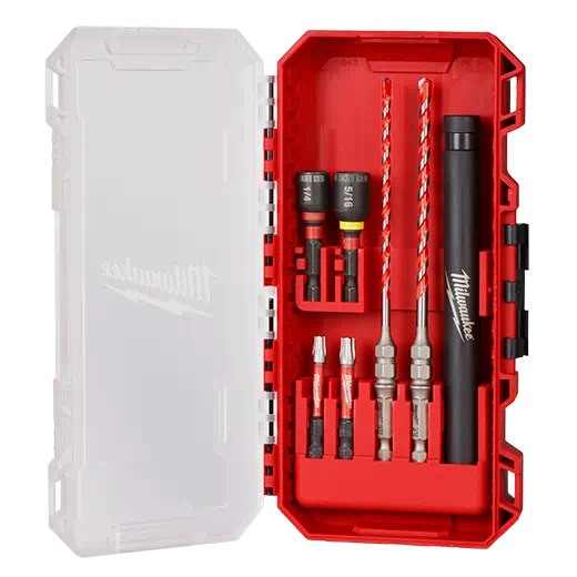 Our Concrete Screw Installation Kit provides a durable and versatile solution for fast installation of concrete screws. This complete drive system is designed for concrete screw drilling AND driving applications, giving our users the ability to use only one tool for the job – resulting in increased productivity and fewer bit swaps. Our SHOCKWAVE Impact Duty™ Carbide Hammer Drill Bits use sharpened carbide to deliver up to 5X longer life in concrete and up to 2X faster drilling into masonry materials. These bits are engineered with a built-in hex collar for perfect hole depths every time. The included magnetic, SHOCKWAVE Impact Duty™ Concrete Screw Nut Drivers bear a recessed shoulder feature, which prevents concrete screws from snapping during installation and ensures the anchor is set to the perfect depth. Our Drill/Drive sleeve connects to the drill bits and driver bits for quick and easy anchor installations without the need to carry two tools and extra bits. Optimized for performance in any impact driver, drill/driver, and hammer drill. Packaged in a medium, single-sided hard case designed for use in our PACKOUT™ Storage System.