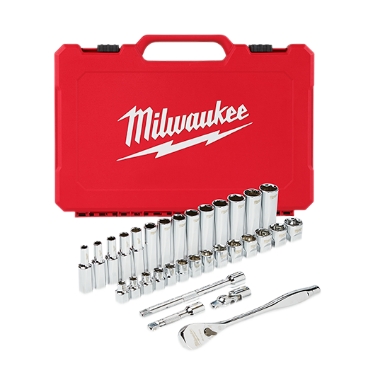 Our MILWAUKEE® SAE 32 piece 3/8" drive Ratchet & Socket set is designed from the ground up, offering our users the Most Versatile Sockets that are Anti-Roll and Wrench-Ready. Its innovative FOUR FLAT™ Sides feature an anti-roll and wrench-ready design. The 90 tooth ratchet tool offers 4° of arc swing and a slim profile design, allowing you to work in tighter and more confined spaces, be it under the hood of a car or in the middle of a remodel. The ratchet and socket kit comes with a removable inner tray which is perfectly designed to be stored long-term in a steel storage chest. All of our sockets are stamped with metric measurements on the flat side for easy-to-read visibility. The set comes with accessories included so that our users can get every job done, both in the garage and on the jobsite. Our ratchet and socket set is backed by our Lifetime Guarantee.