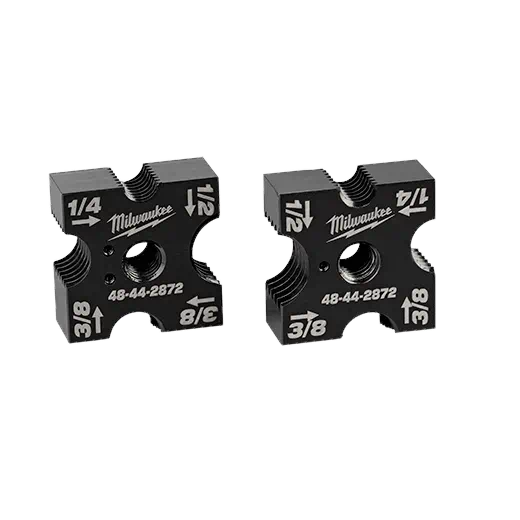 Our Multi-Size 1/4”, 3/8”, and 1/2” Replacement Threaded Rod Cutting Dies produce clean, burr-free cuts. The superior blade geometry effortlessly cuts through 1/4", 3/8", 1/2" grade a mild steel & 1/4", 3/8" stainless steel coarse threaded rod, without creating chips or sparks. The four-sided rotatable threaded rod cutter dies allow you to cut all three sizes of threaded rod with the same tool. Size markings are clearly indicated on the all thread cutter dies as well as markings for upper and lower jaw placement. The replacement dies are compatible with our M18™ Brushless Threaded Rod Cutter (2872-20) and our M18™ Brushless Threaded Rod Cutter Kit (2872-21).