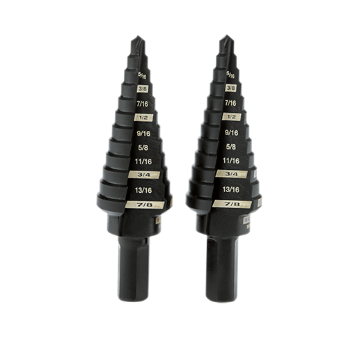Our line of step drill bits far surpasses the competition. With our single cutting edge design, you will have more control and a cleaner finish. Made of high speed steel, these new step drill bits are durable and designed to drill through most metals. The black oxide finish prevents corrosion and has great capacity to work with drilling lubricants. The new speed start tip prevents bit walking and allows faster penetration. With laser etched markings you will always know your hole sizes...no guess work! Finally, the 3-flat shank on the largest bit prevents slipping while the 1/4 in. hex shank on the two smaller bits allows for fast bit change in impact drivers and sure grip in chucks.
