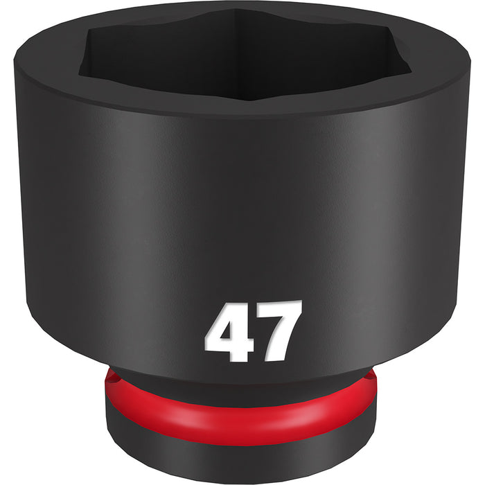 The MILWAUKEE® SHOCKWAVE Impact Duty™ 3/4" Drive 47MM Standard 6 Point Socket features the boldest, longest-lasting markings and extreme impact durability in high torque applications. The stamped and ink-filled size marking enables an accurate socket selection every time throughout the life of the socket. Engineered with high-strength forged steel for optimized performance in heavy-duty applications, and a non-slip hex geometry prevents fastener rounding. The dual-hole design and ring groove allow for easy socket attachment and removal. All SHOCKWAVE Impact Duty™ Sockets are backed by a Lifetime Guarantee and meet ASME industry standards. Compatible with optional Retaining Ring (49-66-6744).
