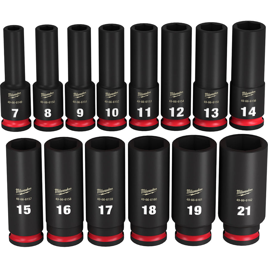 The MILWAUKEE® 14-Piece SHOCKWAVE Impact Duty™ 3/8 in. Drive Metric Deep 6 Point Socket Set features the boldest, longest-lasting markings and extreme impact durability in high torque applications. The stamped and ink-filled size marking makes selecting the right socket every time easy throughout the life of the socket. These Milwaukee sockets are engineered with high strength forged steel for optimized performance in heavy-duty applications. The non-slip hex geometry prevents fastener rounding, and a dual-hole design and ring groove allow for easy socket attachment and removal. The customizable Socket Rail comes with removeable end caps to add or take off socket clips for optimal storage. All SHOCKWAVE Impact Duty™ ™ Sockets backed by a Lifetime Guarantee and meet ASME industry standards.