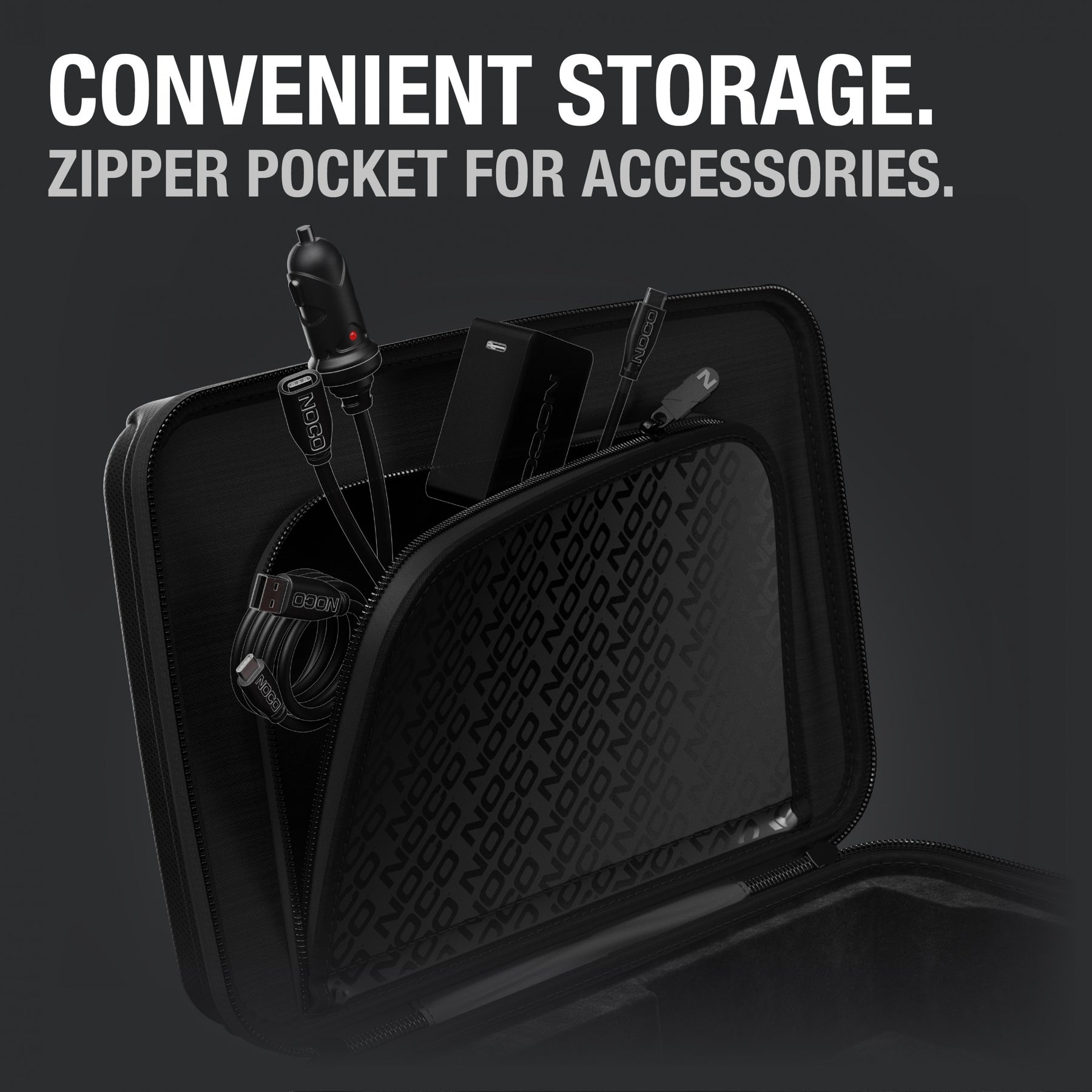 The lightweight, durable, and rugged GBC104 EVA Protective Case has a semi-rigid custom exterior with zipper closures and a reinforced handle. The rubberized EVA exterior offers protection from moisture, impact, dust, and other environmental factors, while the molded interior perfectly fits, stores, and protects its corresponding NOCO Boost X UltraSafe lithium jump starters— the GBX155 (sold separately).The GBC104 case has additional pockets for carrying related Boost accessories (sold separately). Store the protective case easily in your trunk, vehicle, console, or garage.