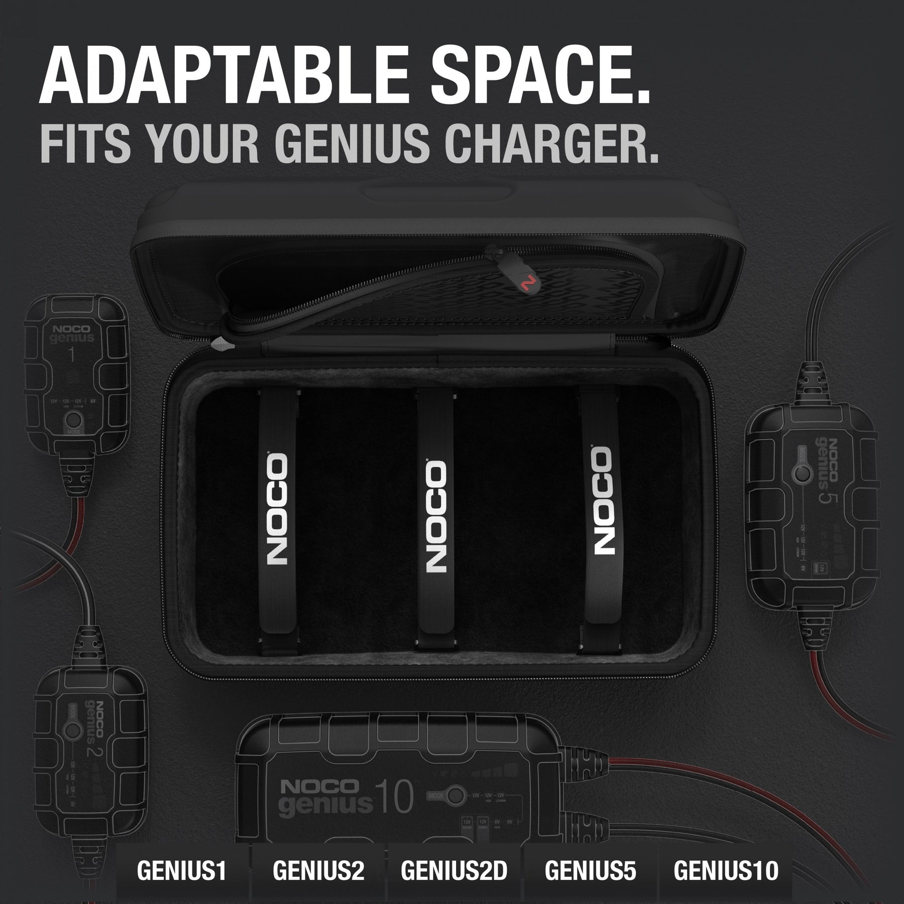 • Customized to fit the GENIUS1, GENIUS2, GENIUS5, and GENIUS10 chargers, plus included accessories.