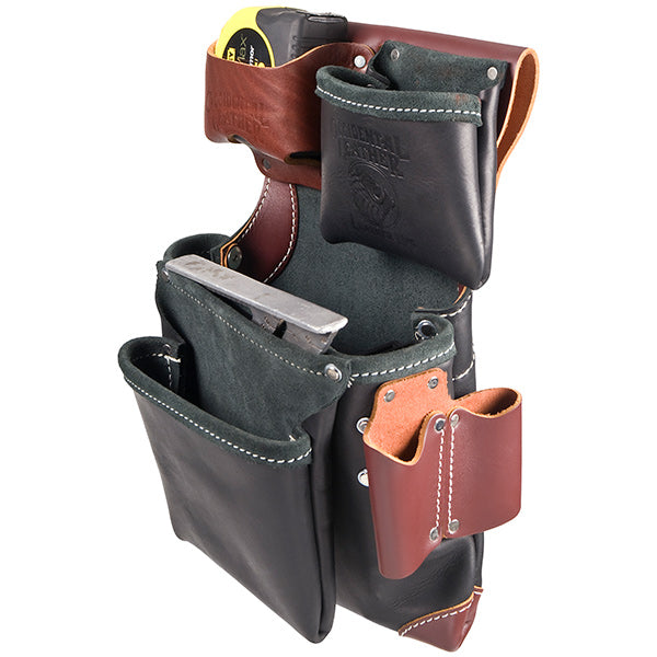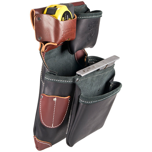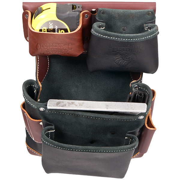 MADE IN USA! The best of both worlds! Classic black all leather fastener bag! Offers side by side 35′ tape holster and an upper bag with external sleeve pockets, drill bit holsters, and an angle square holster. An internal, 2003 - Oxy Tool Shield is included. Main bag features reinforced back wall at stress points to insure years of durable wear.