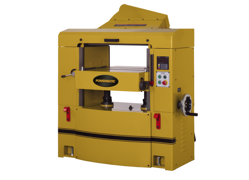 The Powermatic® WP2510 Planer has a solid steel helical cutterhead with 174 four-sided carbide knife inserts that require no adjustments when changing. With a digital readout and simple PC controller, setting up table heights is quick and easy. The frame is machined from heavy cast iron and has extra wide side panels that offer rigid bed support and ensure accurate alignment. The planer's segmented, serrated infeed roll with segmented chip breakers has an independent yield of 1/4. Its automatically adjusting, chain drive gear box powers the 3" diameter infeed rollers, solid pressure bar and dual outfeed rollers for precise feeding of stock. The 3-speed feed selector gives woodworkers flexibility by changing feed rates quickly and easily. The WP2510 Planer has a large 32-3/16" x 26" precision-ground table which contains two adjustable table rollers for smooth feeding of uneven stock.