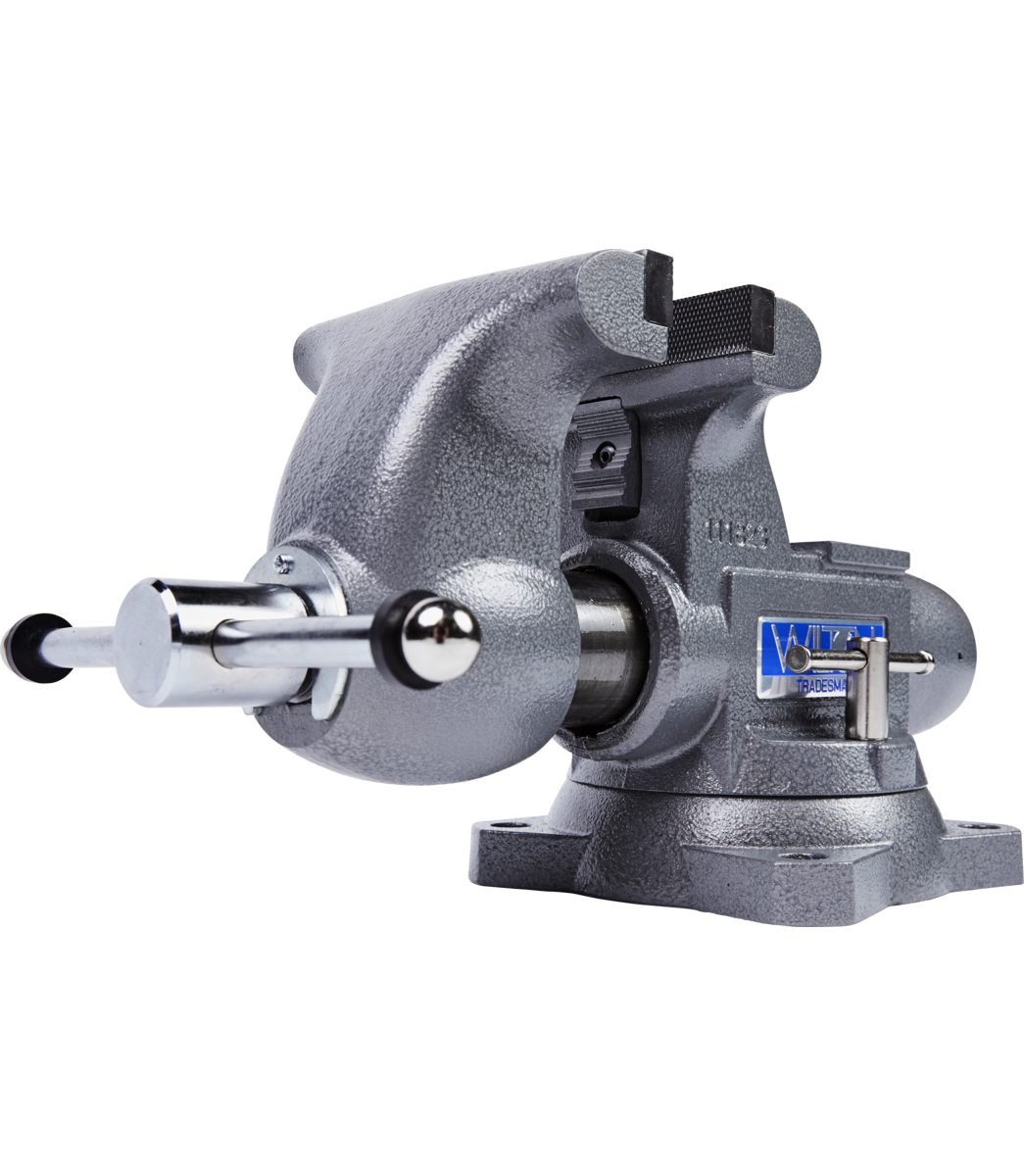 The Tradesman round channel vise is designed to handle the most demanding clamping applications. Unlike most vises that have a fixed center nut the Tradesman round channel vise nut is anchored at the rear which provides straight line pull and even pressure resulting in greater durability. The round channel design also allows for a completely enclosed spindle and nut assembly keeping debris out and lubrication in for a lifetime of smooth operation. For ultimate versatility, the Tradesman vise is equipped with main jaws, pipe jaws and a machined anvil work surface.